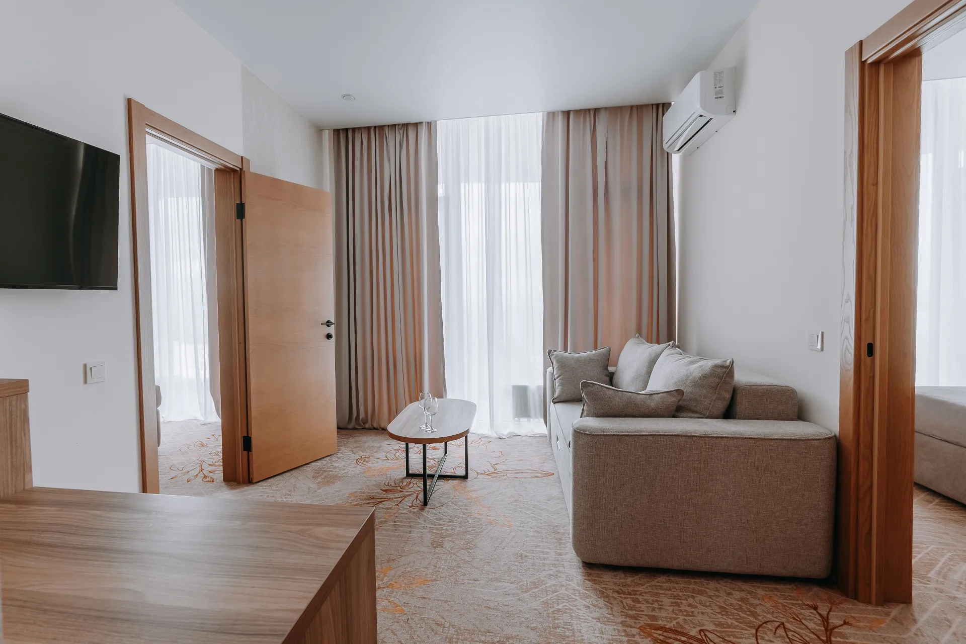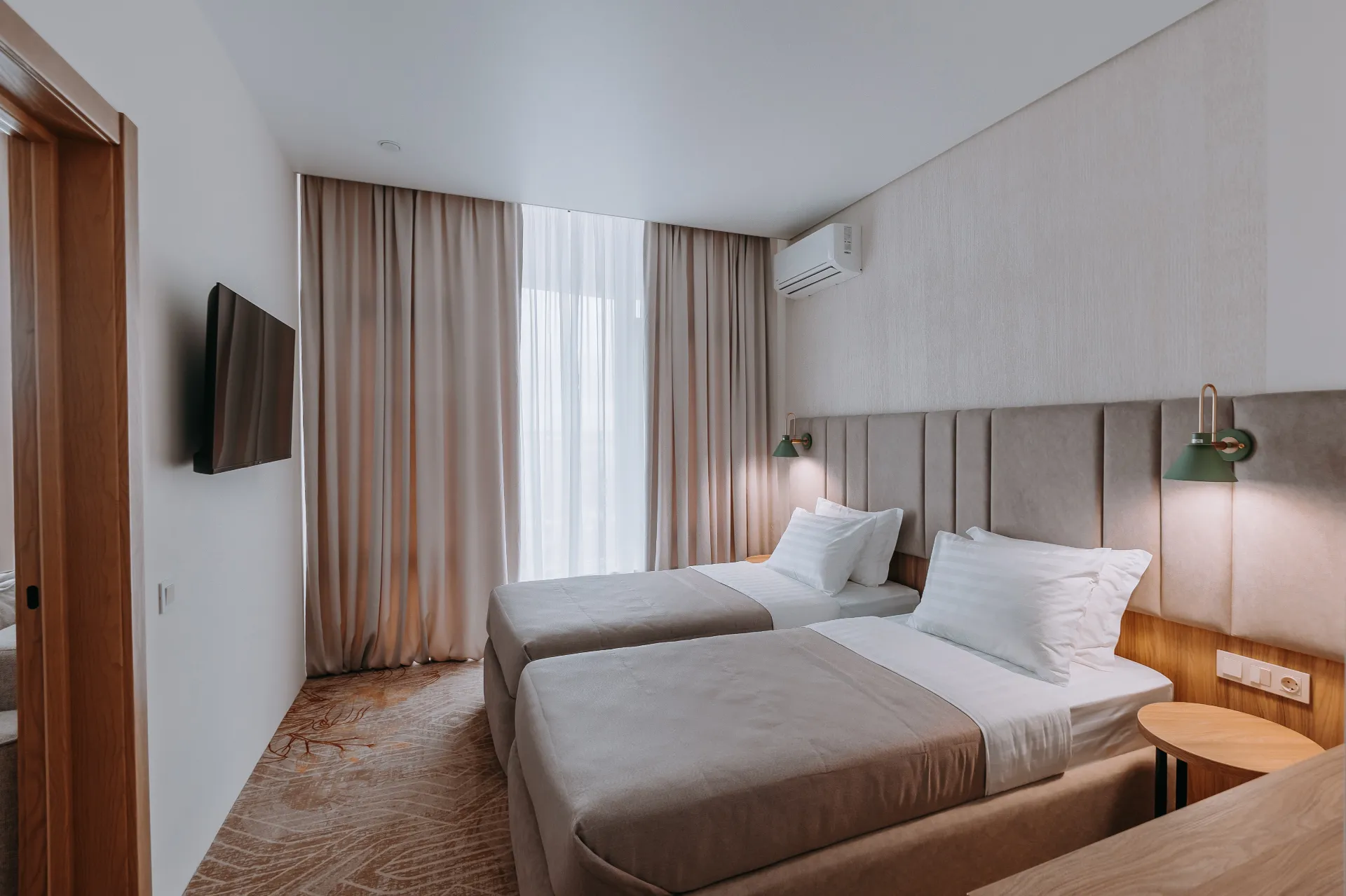 В номере: две двухспальные кровати, диван, ТВ, холодильник, чайная станция, кофе-машина, сплит-система, телефон, сейф, гладильная доска, утюг.